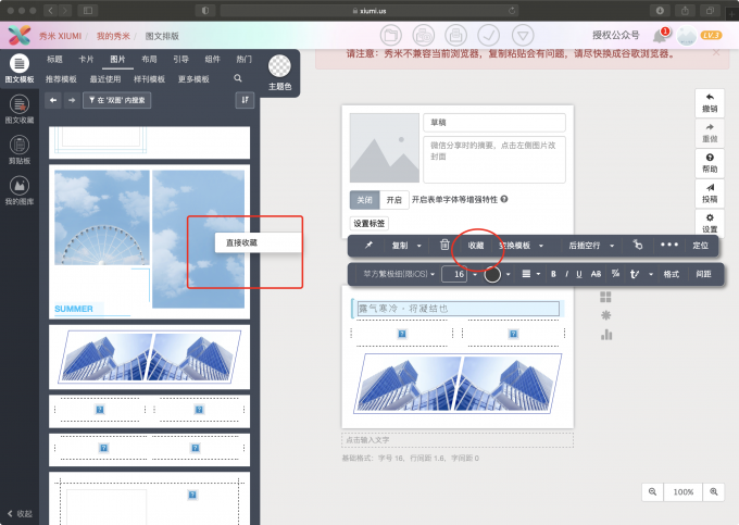 模版收藏,为了方便大量模版的引用,可以在心仪的模版鼠标右击直接收藏,或者在编辑栏上的工具栏上收藏