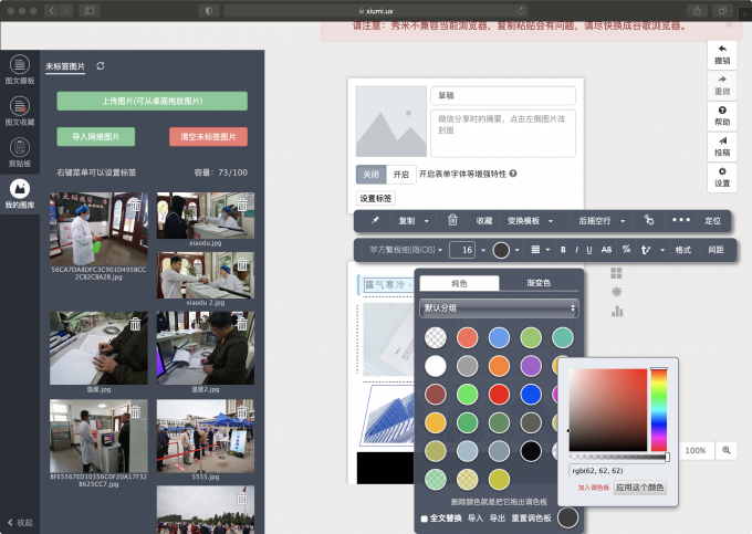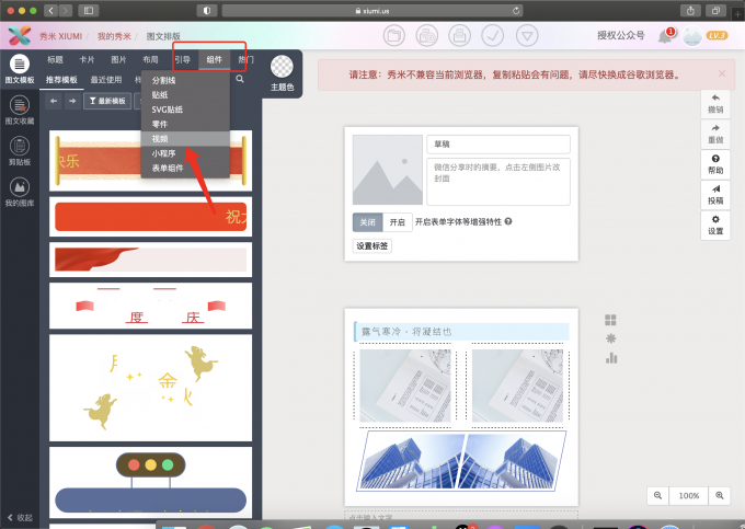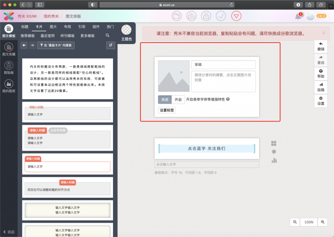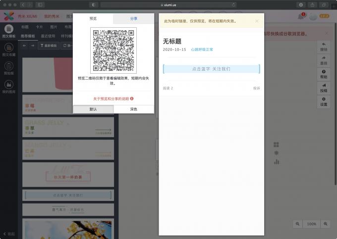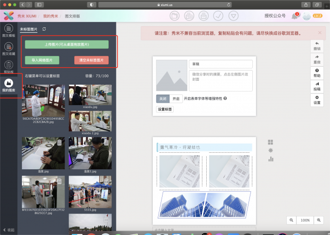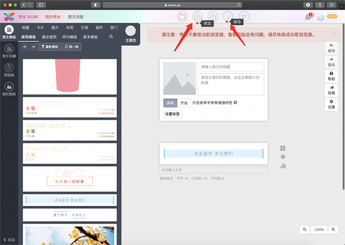 秀米编辑平台与常用浏览器可能不兼容,建议下载谷歌浏览器使用。