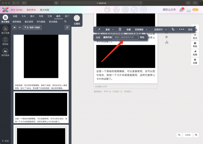 - 在编辑页左侧栏中选 组件—视频 然后选择模版