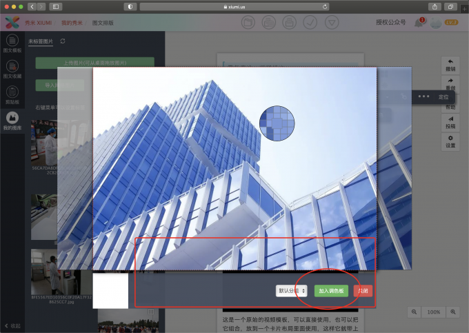 - 点击图片在下工具栏中选择取色,选取想要的颜色加入到色板中即可