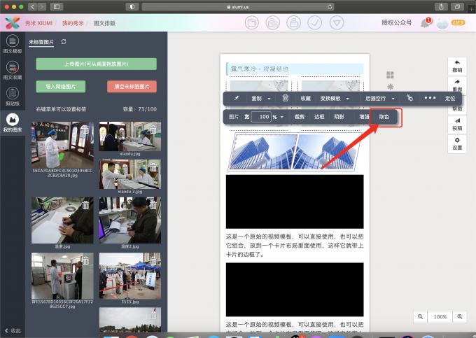 - 在编辑页面我的图库中选择上传图片,本地图片可以直接选择上传,网络资源则右击图片,菜单栏获取图片地址通过导入外链获取,微信图片链接粘贴导入即可。