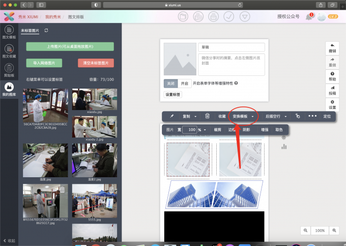 - 点击模版在工具栏中选择变换模版,然后在左侧图文模版中选择即可
