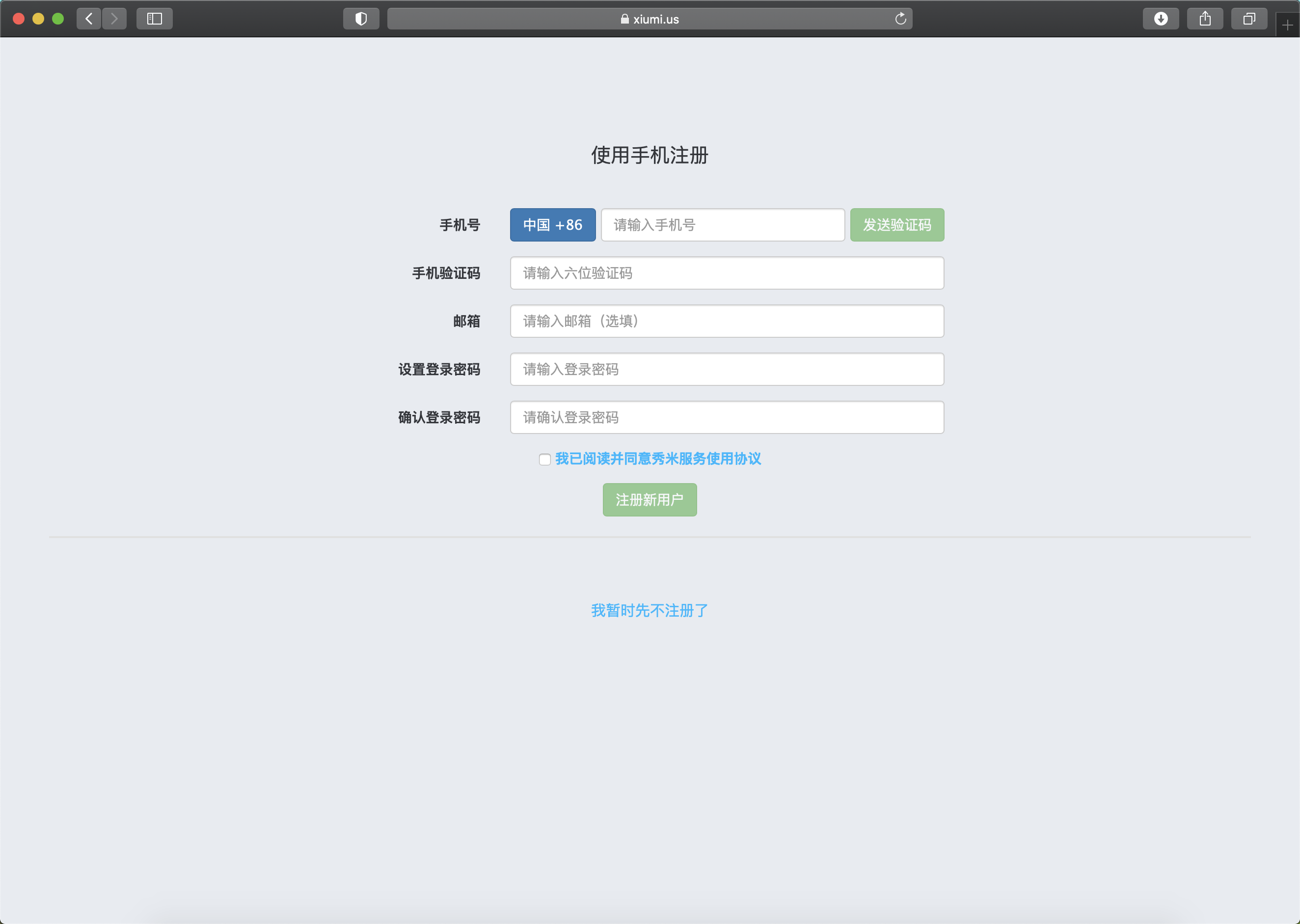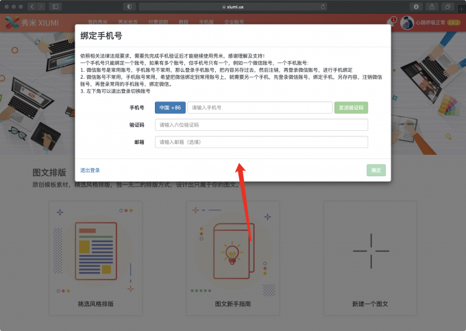 登陆秀米官网:https://xiumi.us/#/ 通过手机号或邮箱申请账号。